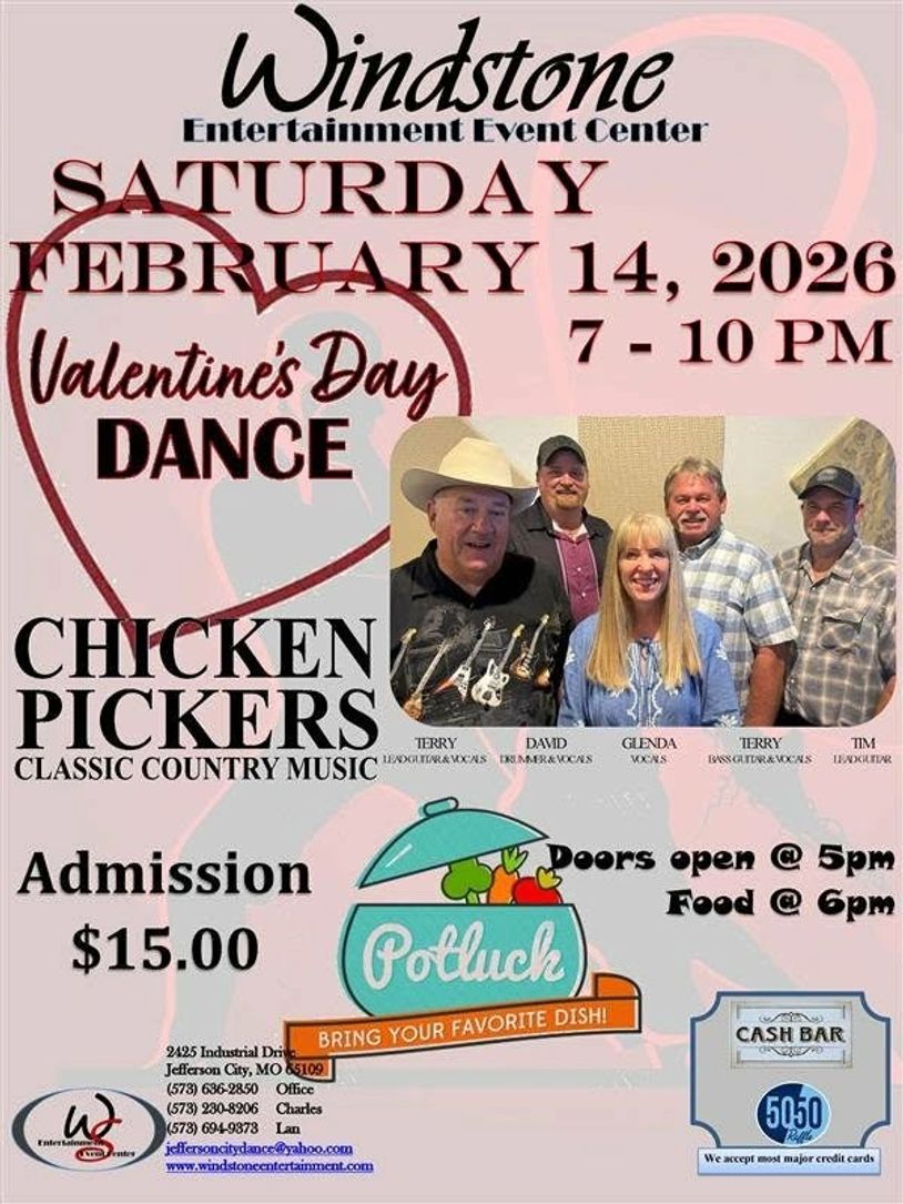 Windstone Valentine's dance Saturday February 14, The Chicken Pickers Band playing all the classic country music, Door open at 5pm, Potluck meal at 6pm, and dance 7-10pm. Please bring your favorite dish to share.